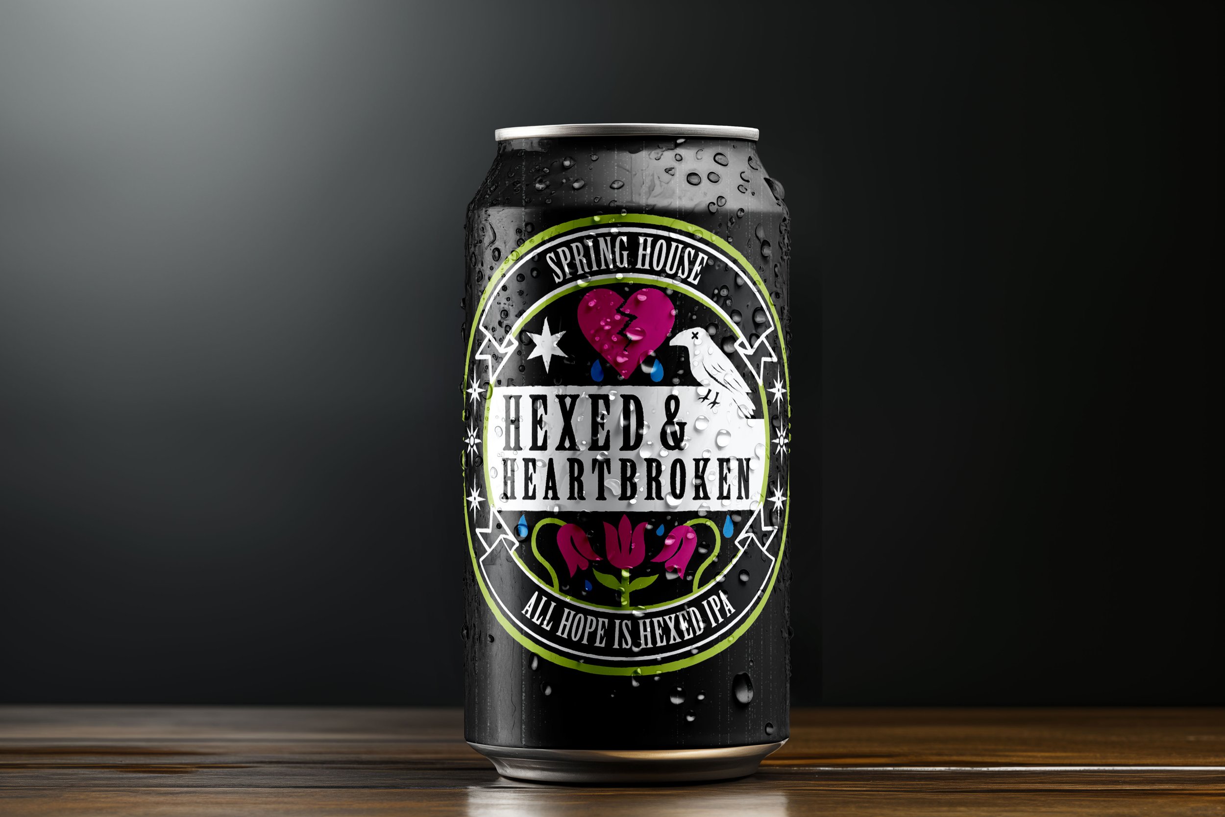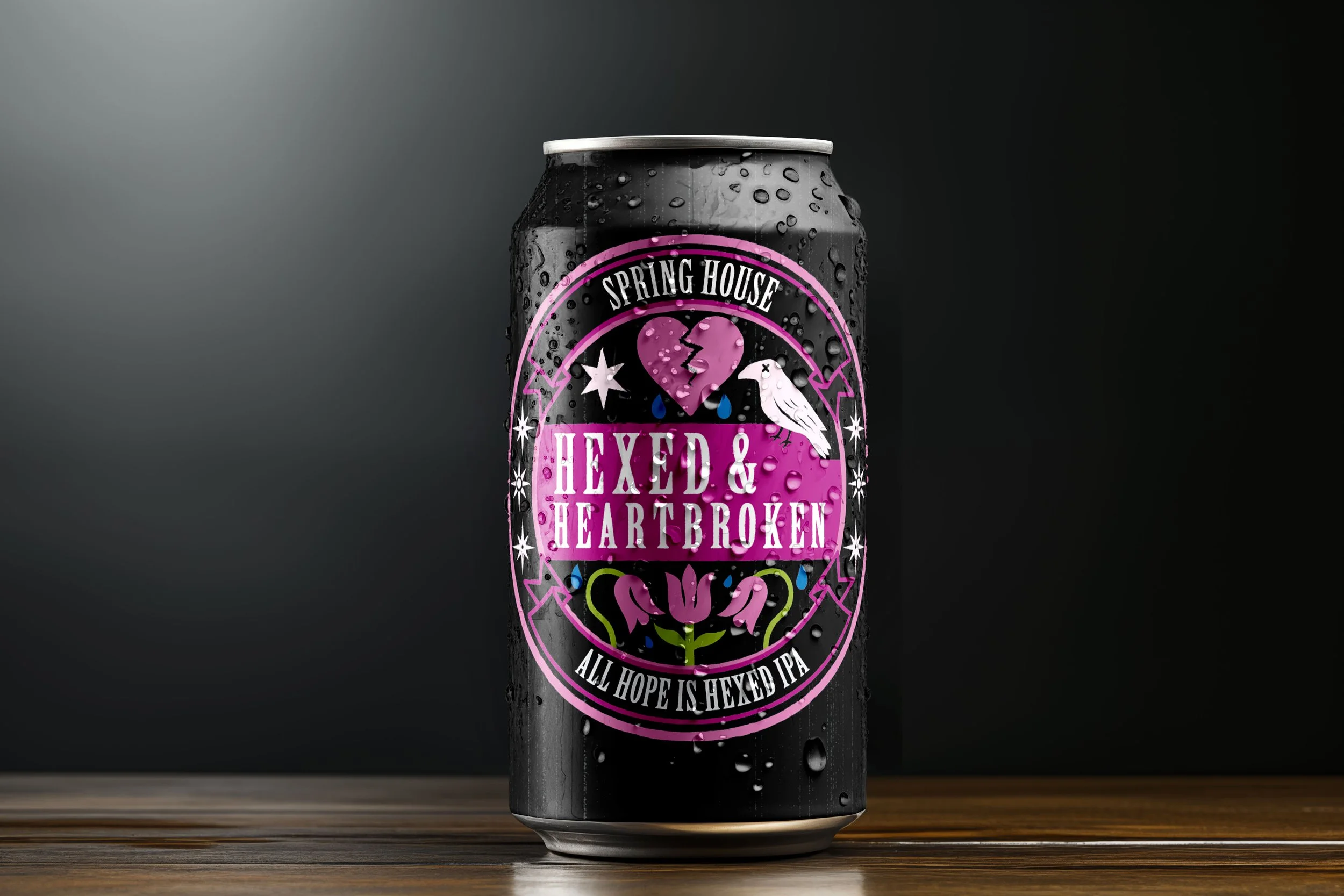 This design carries the same fusion of emo-inspired style and Pennsylvania Dutch heritage, but its darker black background with bold neon accents makes it feel even more intense, perfect for a Double IPA. The broken heart and raven highlight the emotional edge of the emo aesthetic, while the tulips and star elements connect back to local hex sign traditions. A Double IPA fits this look well because it’s a stronger, bolder beer, just like the high-contrast visuals. The artwork and beer together create an impactful pairing that feels expressive, memorable, and aligned with Spring House Brewing’s edgy identity.