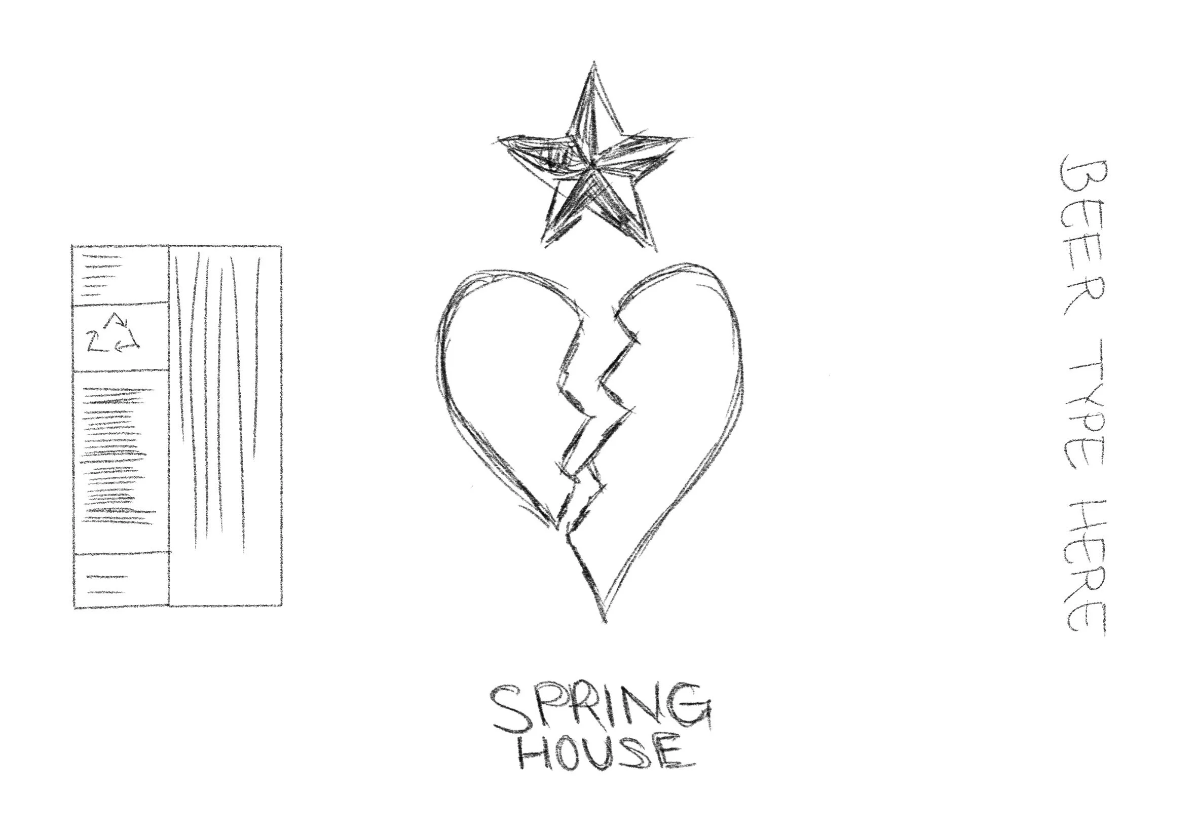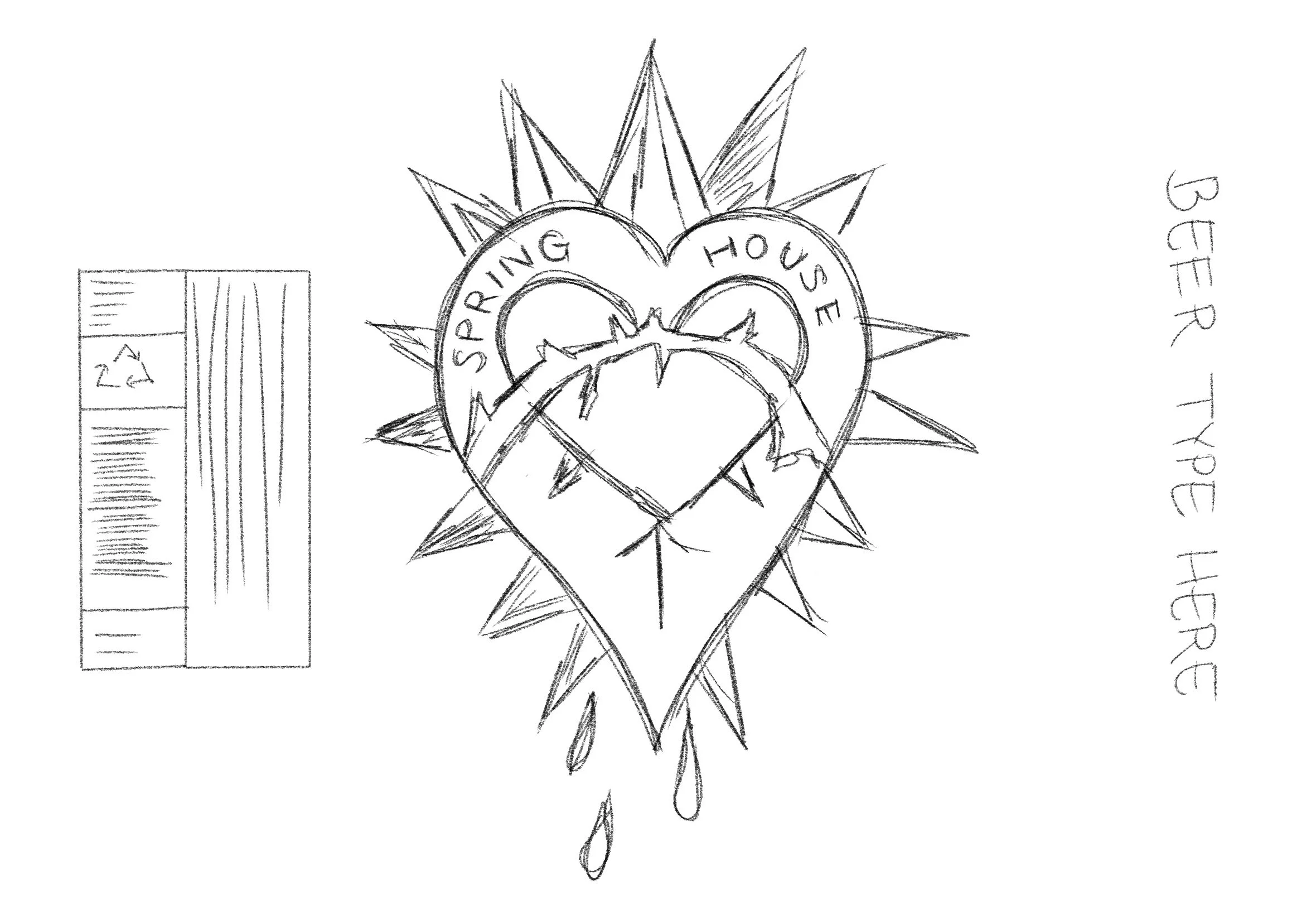 These initial thumbnail sketches explore iconography, symbolism, and emotional tone for a limited-run beer label concept. Inspired by traditional tattoo motifs, folk imagery, and “emo” visual language, I experimented with hearts, stars, banners, and hand-drawn type to balance vulnerability and boldness. The goal at this stage was rapid ideation—testing narrative themes, hierarchy, and mood before refining into a cohesive label system that could translate effectively to print.