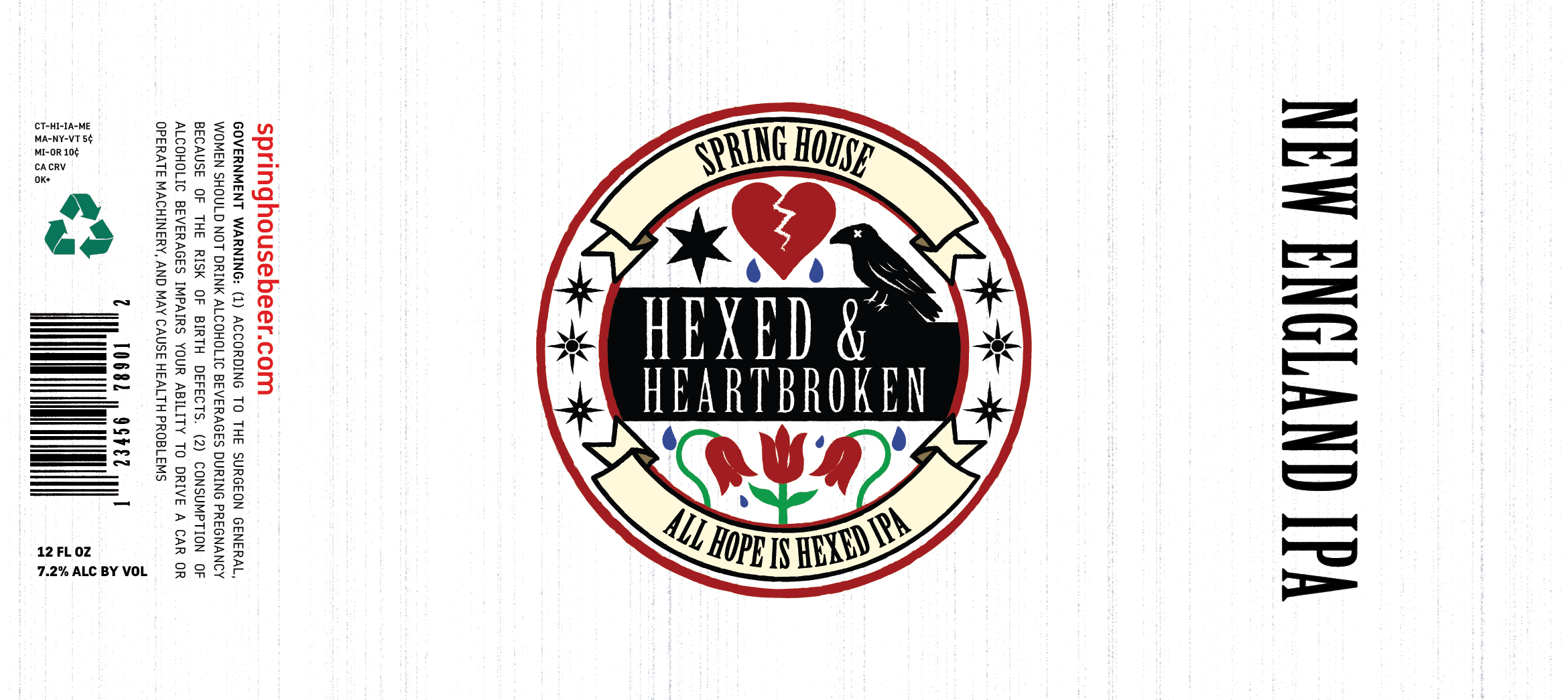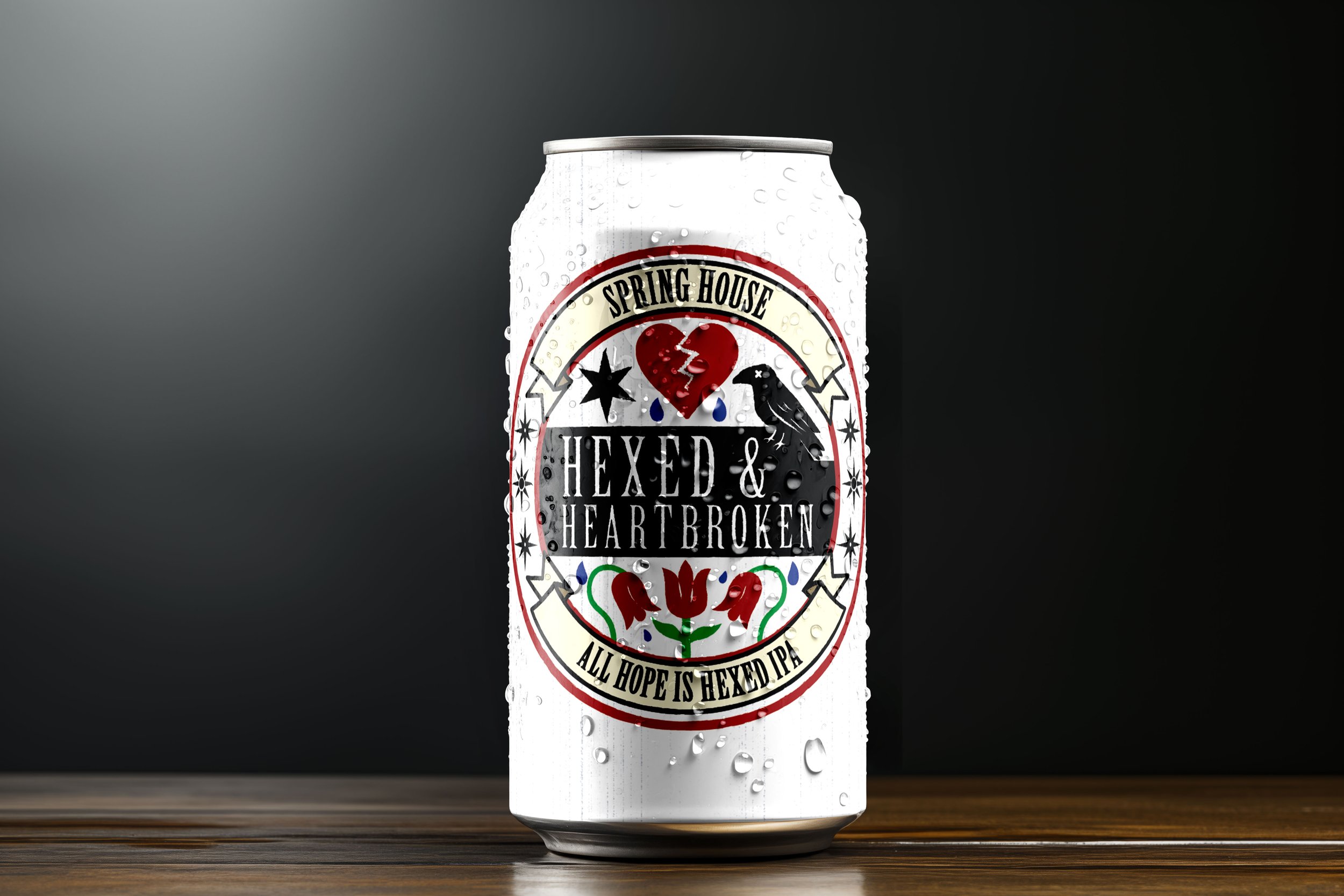 This design blends Spring House Brewing’s emo-inspired aesthetic with Lancaster’s Pennsylvania Dutch heritage. The broken heart, raven, and dark tones reflect the emo influence, while the tulip motifs and star elements nod to traditional hex signs. Pairing this with a New England IPA makes sense, since the hazy, juicy style is bold, flavorful, and attention-grabbing, just like the artwork. Together, the beer and the design create something that feels expressive, unique, and perfectly aligned with the brewery’s creative spirit and audience.